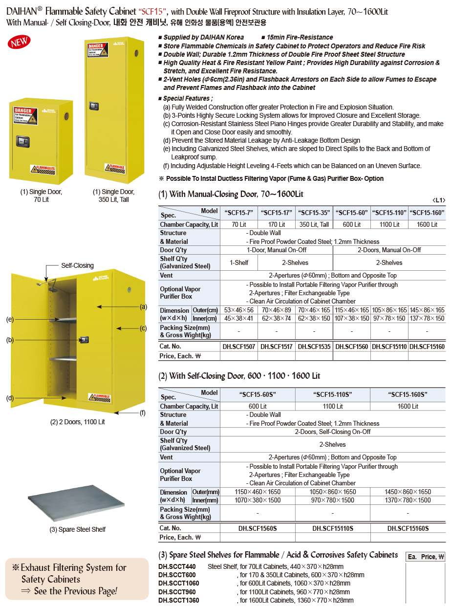 DAIHAN ® Flammable Safety Cabinet “SCF15”, with Double Wall Fireproof Structure with Insulation Layer, 70~1,600Lit With Manual- / Self Closing-Door, 내화 안전 캐비닛, 유해 인화성 물품(용액) 안전보관용