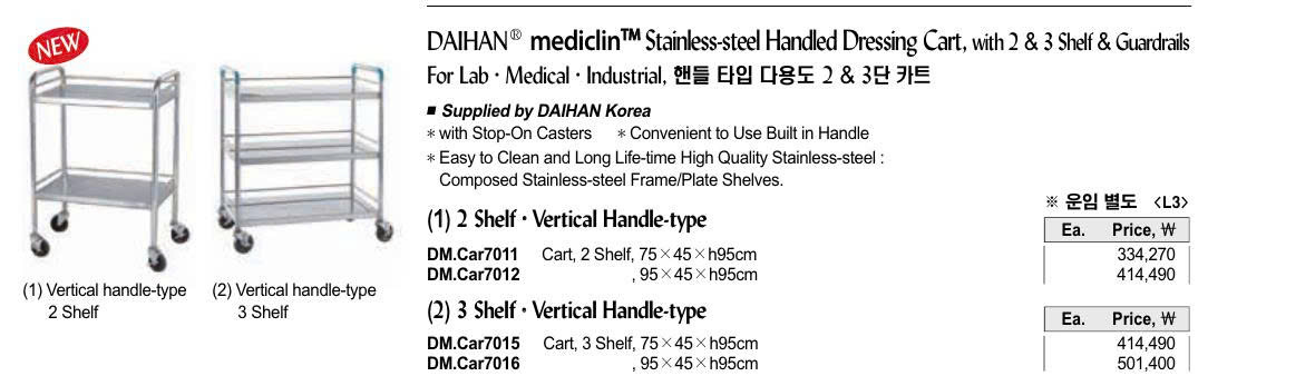 DAIHAN® mediclinTM Stainless-steel Handled Dressing Cart, with 2 & 3 Shelf & Guardrails For Lab·Medical·Industrial, 핸들 타입 다용도 2 & 3단 카트